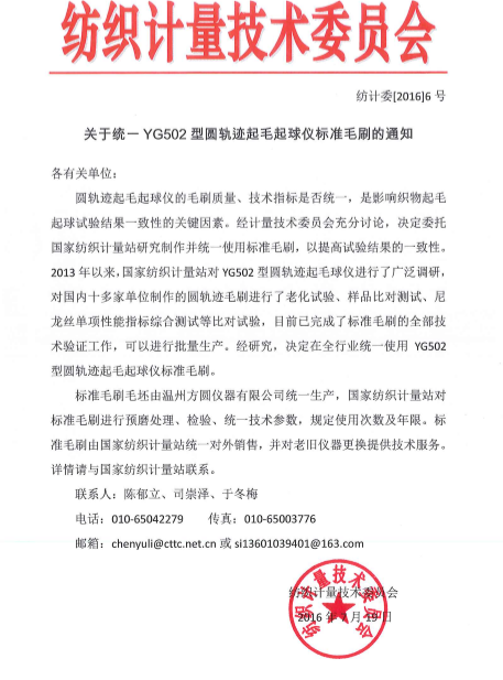 關(guān)于統(tǒng)一YG502型圓軌跡起毛起球儀標(biāo)準(zhǔn)毛刷的通知各有關(guān)單位:圓軌跡起毛起球儀的毛刷質(zhì)量、技術(shù)指標(biāo)是否統(tǒng)一,是影響織物起毛起球試驗(yàn)結(jié)果一致性的關(guān)鍵因素。經(jīng)計量技術(shù)委員會充分討論,決定委托紡織計量站研究制作并統(tǒng)一使用標(biāo)準(zhǔn)毛刷,以提高試驗(yàn)結(jié)果的一致性。2013年以來,紡織計量站對YG502型圓軌跡起毛起球儀進(jìn)行了廣泛調(diào)研,對國內(nèi)十多家單位制作的圓軌跡毛刷進(jìn)行了老化試驗(yàn)、樣品比對測試、尼龍絲單項(xiàng)性能指標(biāo)綜合測試等比對試驗(yàn),目前已完成了標(biāo)準(zhǔn)毛刷的全部技術(shù)驗(yàn)證工作,可以進(jìn)行批量生產(chǎn)。經(jīng)研究,決定在全行業(yè)統(tǒng)一使用YG502型圓軌跡起毛起球儀標(biāo)準(zhǔn)毛刷。 標(biāo)準(zhǔn)毛刷毛坯由溫州方圓儀器有限公司統(tǒng)一生產(chǎn),紡織計量站對標(biāo)準(zhǔn)毛刷進(jìn)行預(yù)磨處理、檢驗(yàn)、統(tǒng)一技術(shù)參數(shù),規(guī)定使用次數(shù)及年限。標(biāo)準(zhǔn)毛刷由紡織計量站統(tǒng)一對外銷售,并對老舊儀器提供技術(shù)服務(wù)。